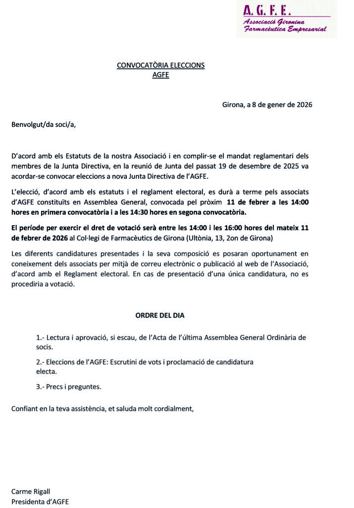 D’acord amb els Estatuts de la nostra Associació, en la reunió de junta del passat 19 de desembre de 2025 va acordar-se convocar eleccions a nova Junta Directiva de l’AGFE.
