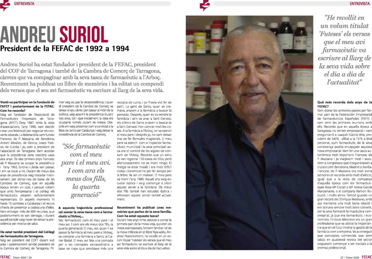 Andreu Suriol ha estat fundador i president de la FEFAC, president del COF de Tarragona i també de la Cambra de Comerç de Tarragona, càrrecs que va compaginar amb la seva tasca de farmacèutic a l’Arboç. Recentment ha publicat un llibre de memòries i ha editat un compendi dels versos que el seu avi farmacèutic va escriure al llarg de la seva vida.