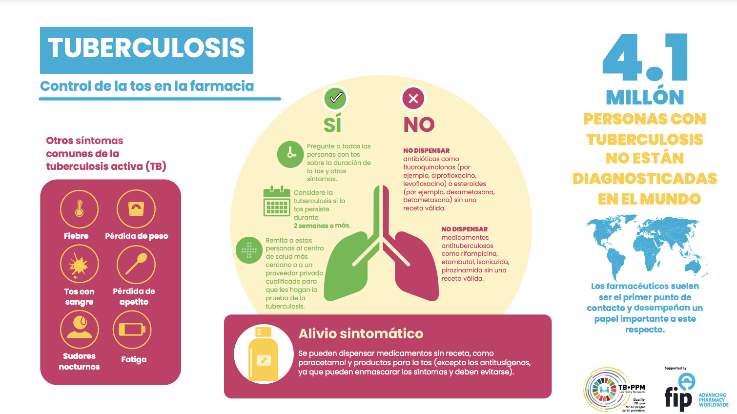 La versió original en anglès de la infografia, que ajuda els farmacèutics a gestionar els símptomes presumptes de tuberculosis (TB), es va publicar en un article a BMJ Global Health en col·laboració amb la Xarxa d’Aprenentatge TBPPM (Tuberculosi: Private-Public Mix) l’any passat. Amb el suport de la FIP, ara està disponible en 20 idiomes, entre ells el castellà.