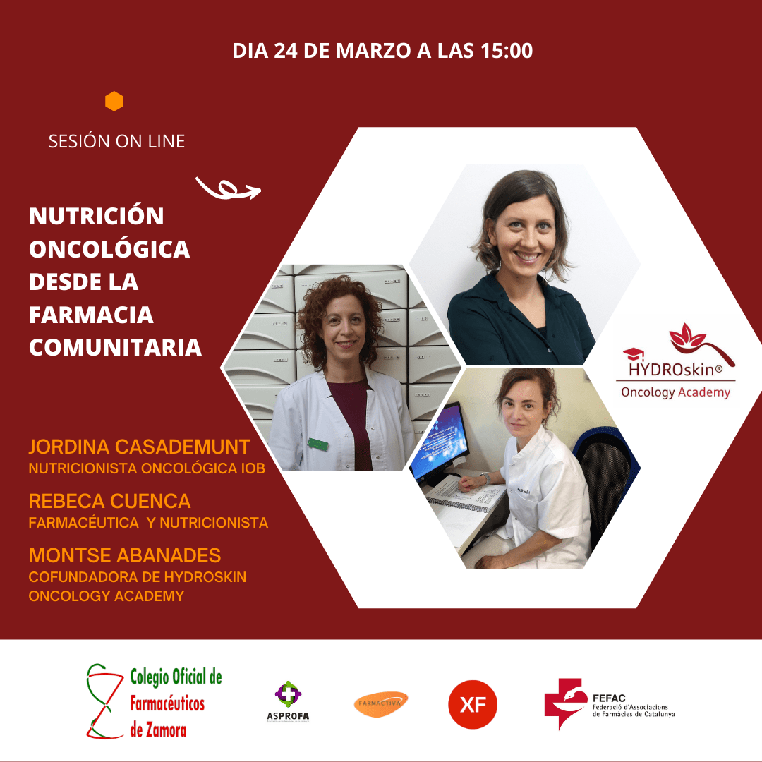 En aquesta sessió sobre nutrició oncològica participa Jordina Casademunt, nutricionista oncològica de l’IOB; Rebeca Cuenca, farmacèutica i nutricionista; i Montse Abanades, cofundadora d’Hydroskin Oncology Academy.