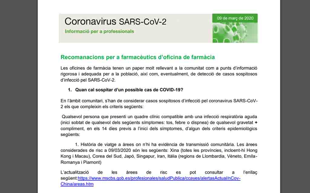 El Departament de Salut i el Consell de Col·legis Farmacèutics de Catalunya acaben de publicar un protocol específic per fer front al coronavirus des de la farmàcia, donat el rellevant paper a la comunitat que aquestes tenen “com a punts d’informació rigorosa i adequada per a la població”.
