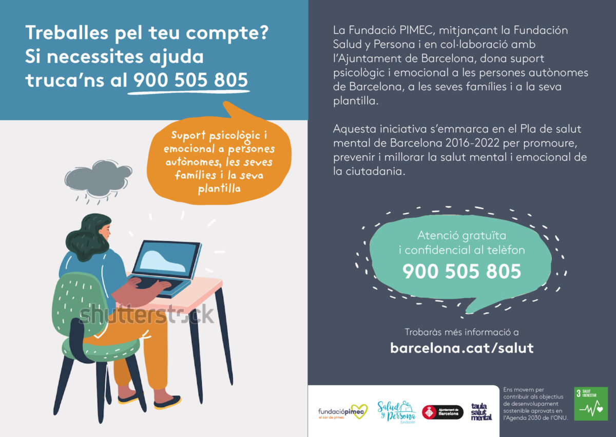 L’Ajuntament de Barcelona, juntament amb la Fundació PIMEC i la Fundació Salut i Persona, des de fa mesos ofereixen acompanyament i suport psicològic i emocional a aquest sector de la ciutat de Barcelona. Només cal trucar al telèfon 900 505 805. Aquest telèfon és gratuït i atès per psicòlegs des de les 6 del matí fins a les 00 hores, els 365 dies de l’any.