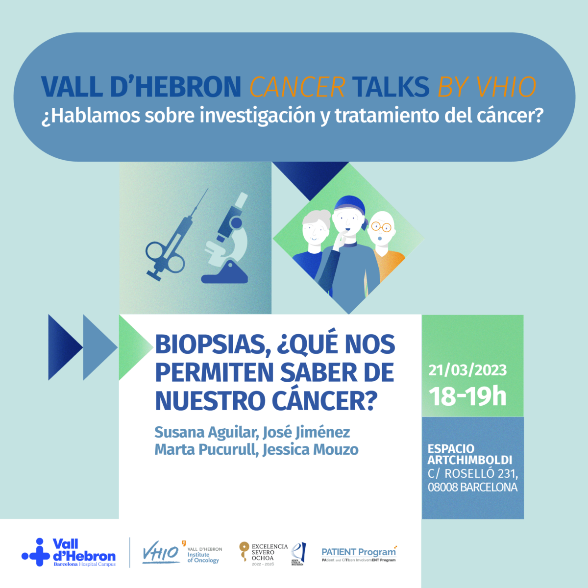 Us convidem a participar en el talk Biopsies, què ens permeten saber del nostre càncer? Tindrà lloc el dimarts, 21 de març, a partir de les 18.00 hores a l’Espai Artchimboldi de Barcelona (C/ Rosselló 231, 08008). Serà a càrrec de la doctora Susana Aguilar, coordinadora del Programa de precribratge Molecular i responsable de la VHIOTECA del VHIO. José Jiménez, supervisor del Laboratori d’Oncologia Molecular i Responsable de Qualitat del VHIO. Comptarà amb la participació de Marta Pucurull com a pacient experta. La xerrada estarà moderada per Jessica Mouzo, periodista d’El País especialitzada en ciència i salut.