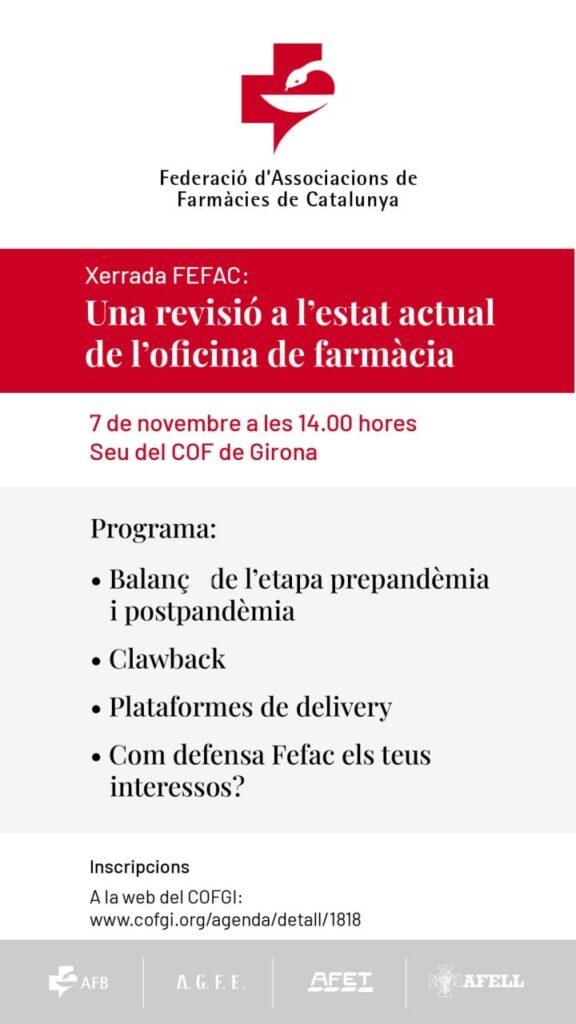 El pròxim dilluns, 7 de novembre, a les 14.00 hores, tindrà lloc a la seu del Col·legi Oficial de Farmacèutics de Girona una xerrada de FEFAC dirigida a farmacèutics i farmacèutiques sota el títol “Una revisió a l’estat actual de l’oficina de farmàcia”.
